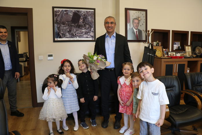 Minik öğrenciler, Rektör Yardımcıları Prof. Dr. Mahmut Durmuş ve Prof. Dr. Hasari Çelebi'yi de ziyaret ederek onlara çiçek takdim ettiler. Öğrencilerin bu anlamlı ziyareti, üniversite kampüsünde bayram coşkusu yaşattı.