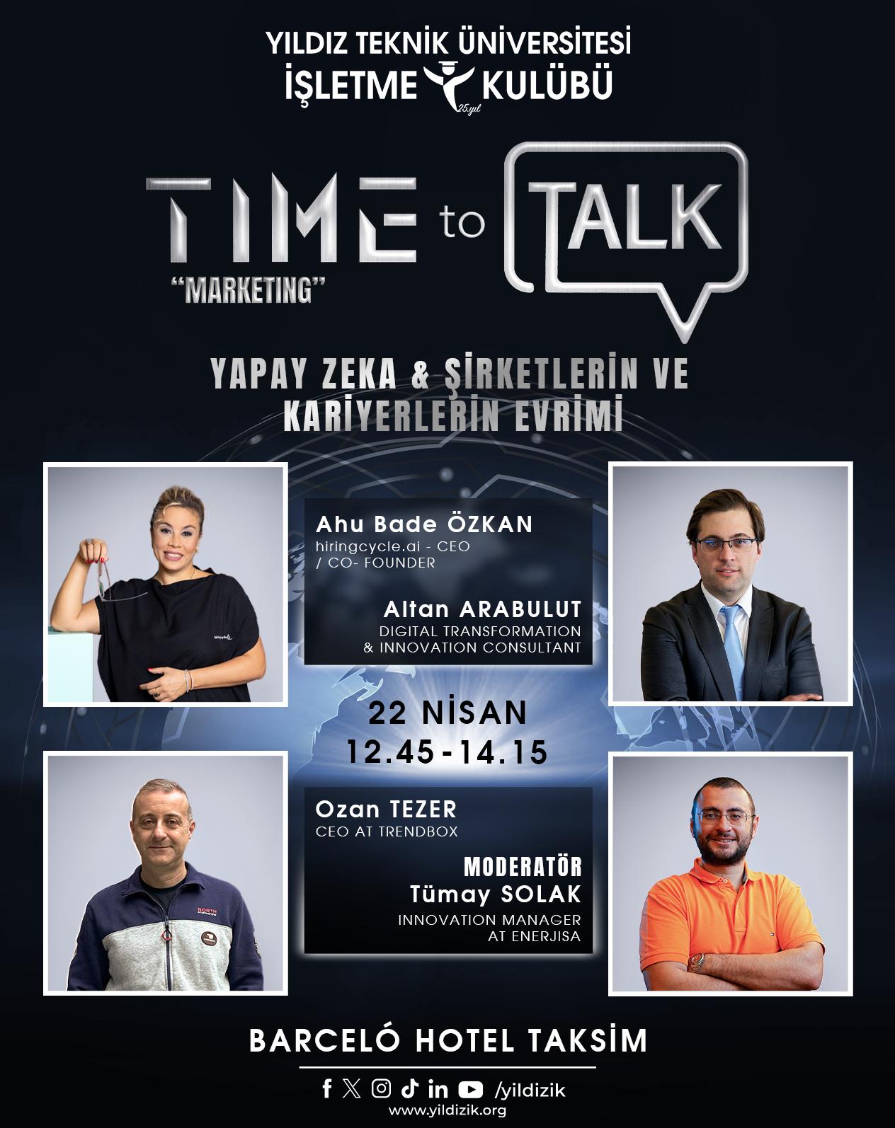 Yıldız İşletme Kulübü yetkilileri, "Time to Talk" etkinliği ile katılımcıların sektör profesyonelleriyle doğrudan etkileşim kurmasını, bilgi alışverişinde bulunmasını ve kariyerlerine yönelik önemli bir adım atmalarını amaçladıklarını belirtiyorlar.