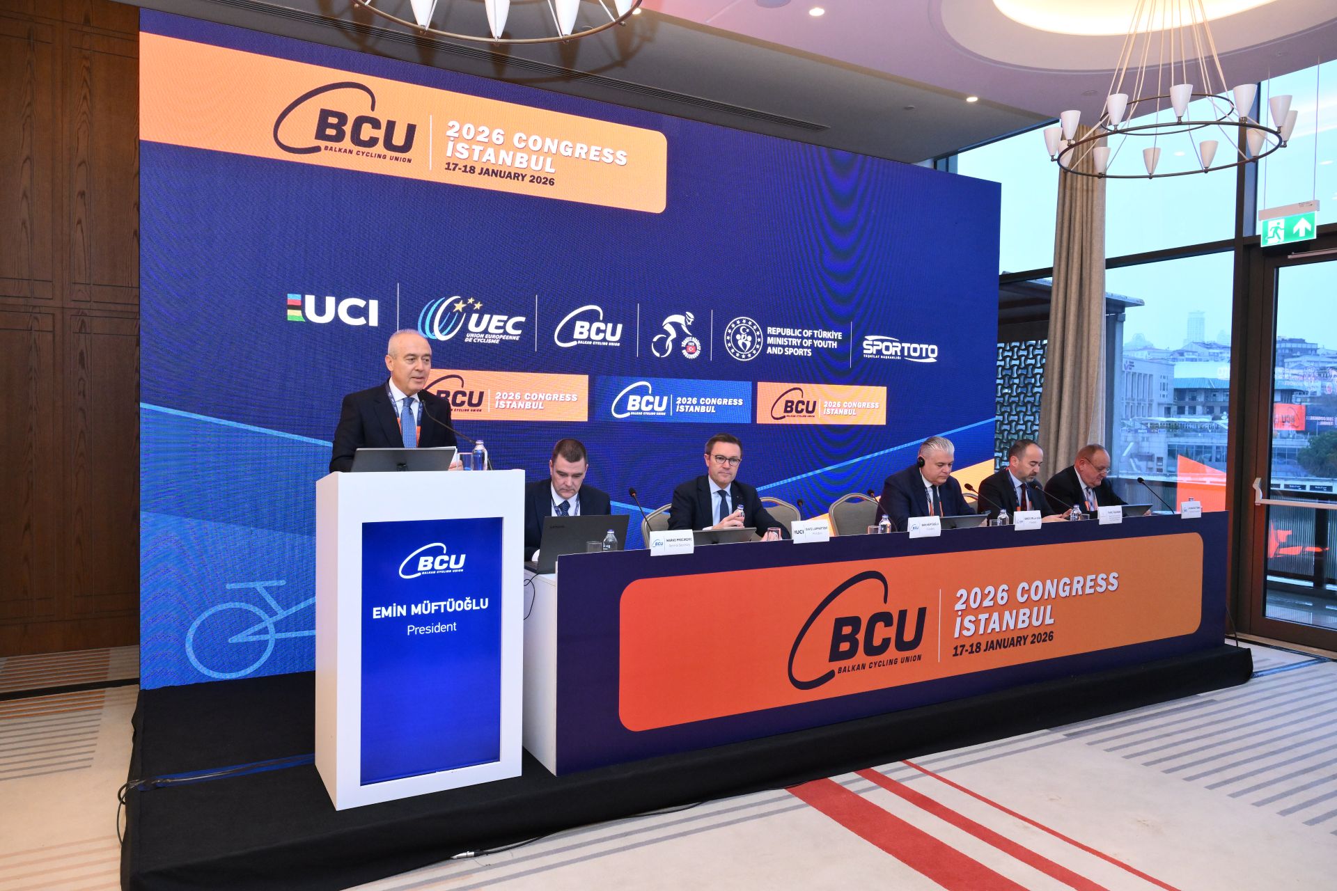 Balkan Bisiklet Birliği (BCU) 2026 Kongresi, 18 Ocak Pazar günü İstanbul’da gerçekleştirildi. Türkiye Bisiklet Federasyonu ve Balkan Bisiklet Birliği Başkanı Emin Müftüoğlu’nun başkanlığında düzenlenen kongreye, 12 Balkan ülkesinin delegelerinin yanı sıra Uluslararası Bisiklet Birliği (UCI) Başkanı ve Uluslararası Olimpiyat Komitesi (IOC) Üyesi David Lappartient ile Avrupa Bisiklet Birliği (UEC) Başkanı Enrico Della Casa da katıldı. Kongreye ayrıca T.C. Gençlik ve Spor Bakanlığı Uluslararası Organizasyonlar ve Dış İlişkiler Genel Müdür Yardımcısı İnanç Özçakmak ile Türkiye Bisiklet Federasyonu Başkan Vekili Fikret Hayali, As Başkan Metin Cengiz, Yönetim Kurulu Üyesi Dr. Kenan Güler, Genel Sekreter Mehmet Sedat Fırat ve Projeler Koordinatörü Doç. Dr. Pınar Arpınar Avşar da katıldı.