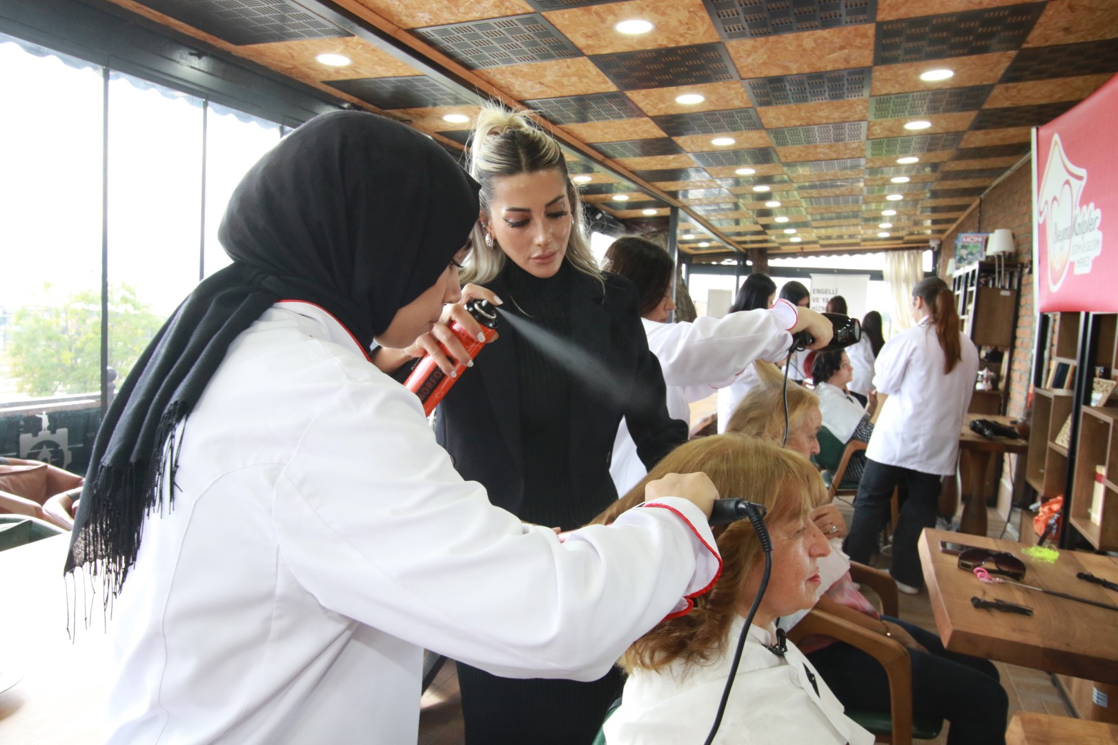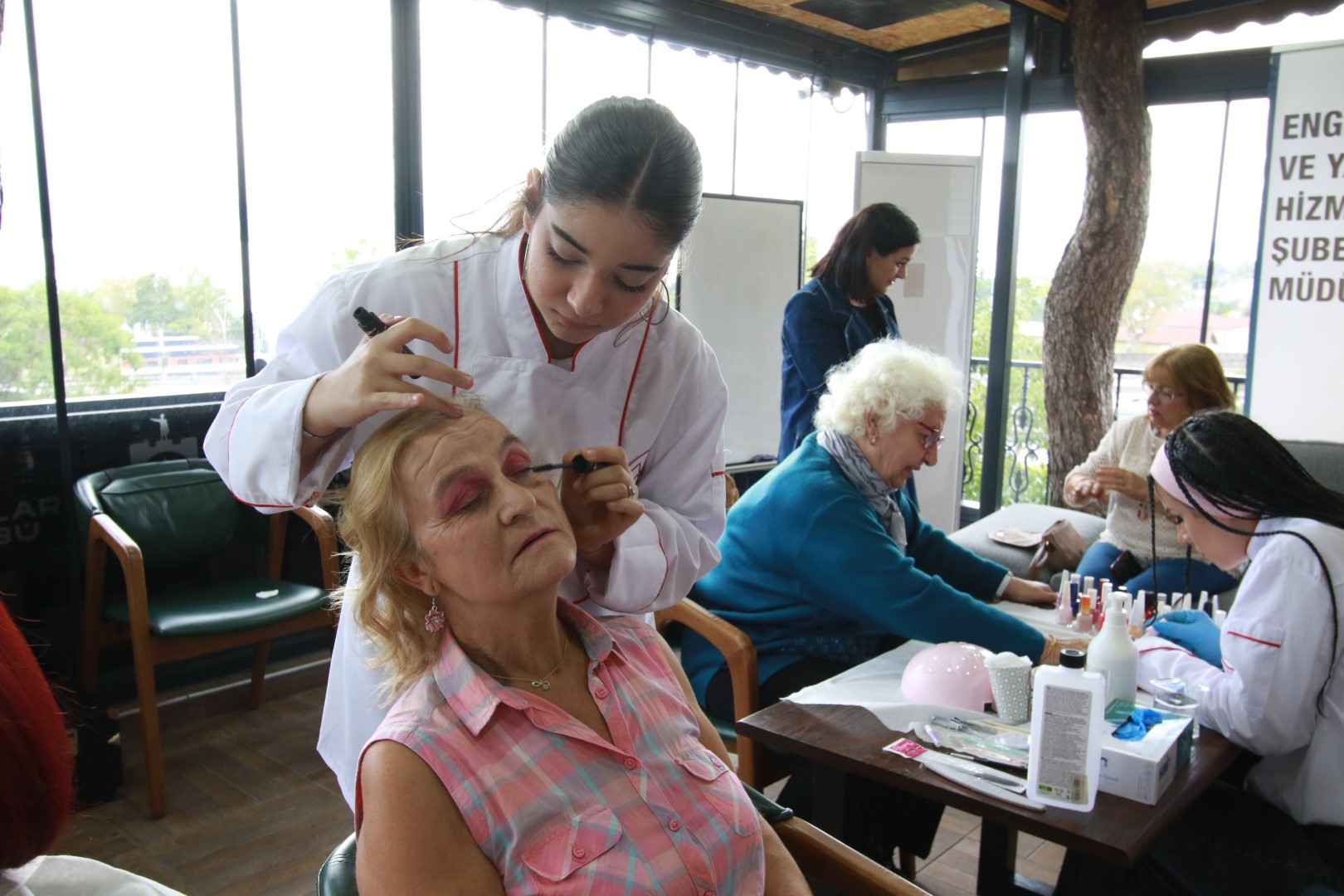 Sağlık ve Sosyal Hizmetler Dairesi Başkanlığı Sosyal Hizmetler Şube Müdürlüğü’ne bağlı Beyaz Kalpler Eğitim ve Gelişim Merkezi’nde öğrenim gören gençler ile Engelli ve Yaşlı Hizmetleri Şube Müdürlüğü’ne bağlı Saygınlar Kulübü üyeleri, anlamlı bir etkinlikte bir araya geldi. Etkinlik kapsamında Beyaz Kalpler Eğitim ve Gelişim Merkezi’nin Kuaförlük ve Güzellik Uzmanlığı Atölyesi’nde eğitim gören öğrenciler, Saygınlar Kulübü üyelerinin kişisel bakım isteklerini yerine getirdi. Öğrenciler büyüklerine saç şekillendirme, fön çekme, maşa uygulama, kaş tasarımı, el bakımı, tırnak şekillendirme ve temel makyaj gibi işlemler uyguladı. O günün makyajı öğrencilerin ellerinden çıkarken, bakımı yapılan saçlar da özenle şekillendirildi. Saygınlar Kulübü üyeleri, gençlerin titiz çalışmasından ve ilgisinden büyük memnuniyet duydu.