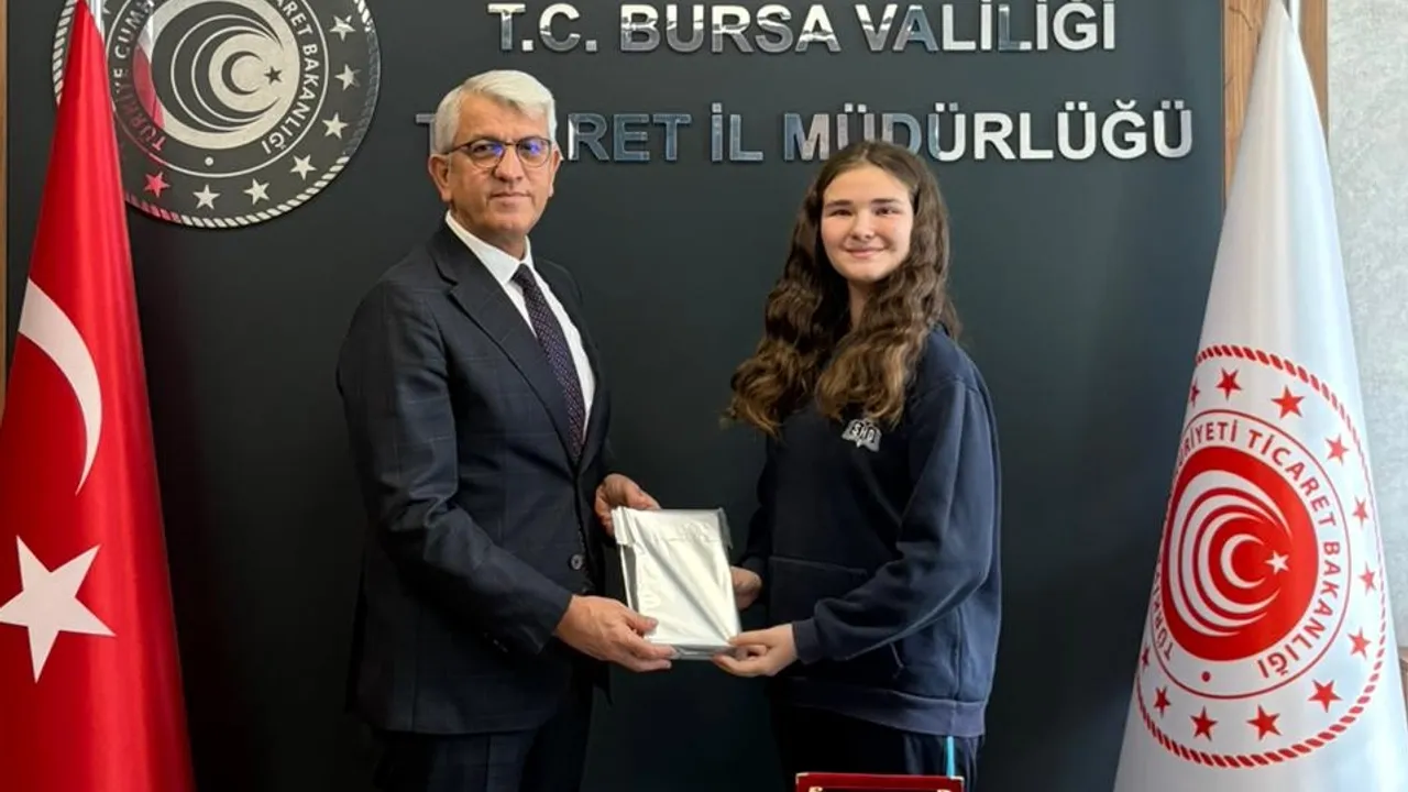 Ticaret Bakanlığı tarafından düzenlenen 'Bilinçli Tüketici Olmak' resim yarışmasında Bursa birincisi seçilen Selçuk Hatun Ortaokulu öğrencisi Esma Gül'e ödülleri takdim edildi.