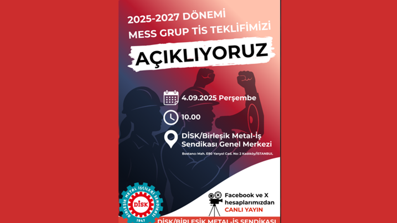 DİSK'e bağlı Birleşik Metal-İş Sendikası, özel sektörün en büyük toplu iş sözleşmelerinden biri olan 2025-2027 Dönemi MESS Grup Toplu İş Sözleşmesi için hazırladığı teklifini yarın kamuoyuna açıklayacak. Yaklaşık 11 bin üyeyi temsilen 32 işletme ve 43 fabrikayı kapsayan teklif, sendikanın genel merkezinde düzenlenecek basın toplantısıyla duyurulacak.