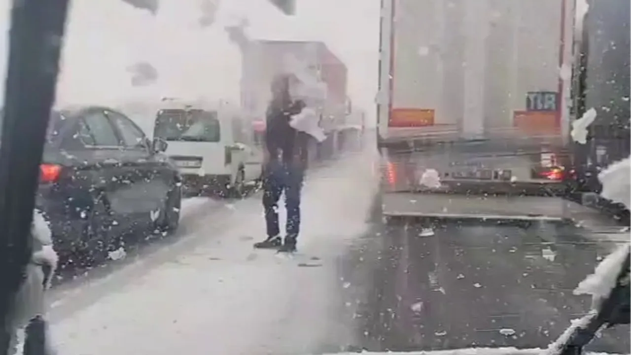 Uzun araç kuyruklarının oluştuğu otoyolda, karayolları ve trafik ekiplerinin yolu açma çalışmaları sürüyor.