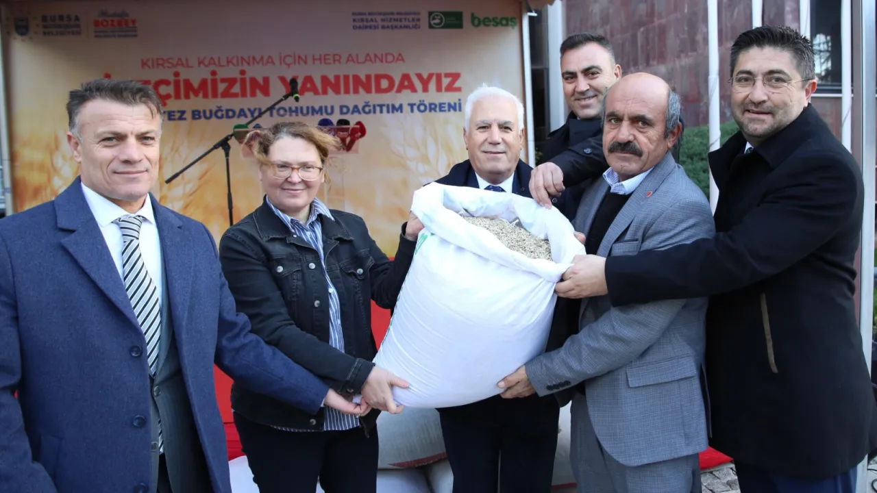 Bursa Büyükşehir Belediyesi, kırsal kalkınma hedefleri doğrultusunda Karacabey, Yenişehir, Harmancık ve Keles ilçelerindeki üreticilere yüzde 75’i hibeli siyez buğdayı tohumu dağıttı.BURSA (İGFA) - Bursa’da köyden kente göçün önüne geçmek adına fide-fidan temininden ürünlerin satış ve pazarlamasına kadar birçok konuda çiftçiye destek veren Büyükşehir Belediyesi, tarımda ürün kalitesinin artması amacıyla çalışmalarını sürdürüyor.