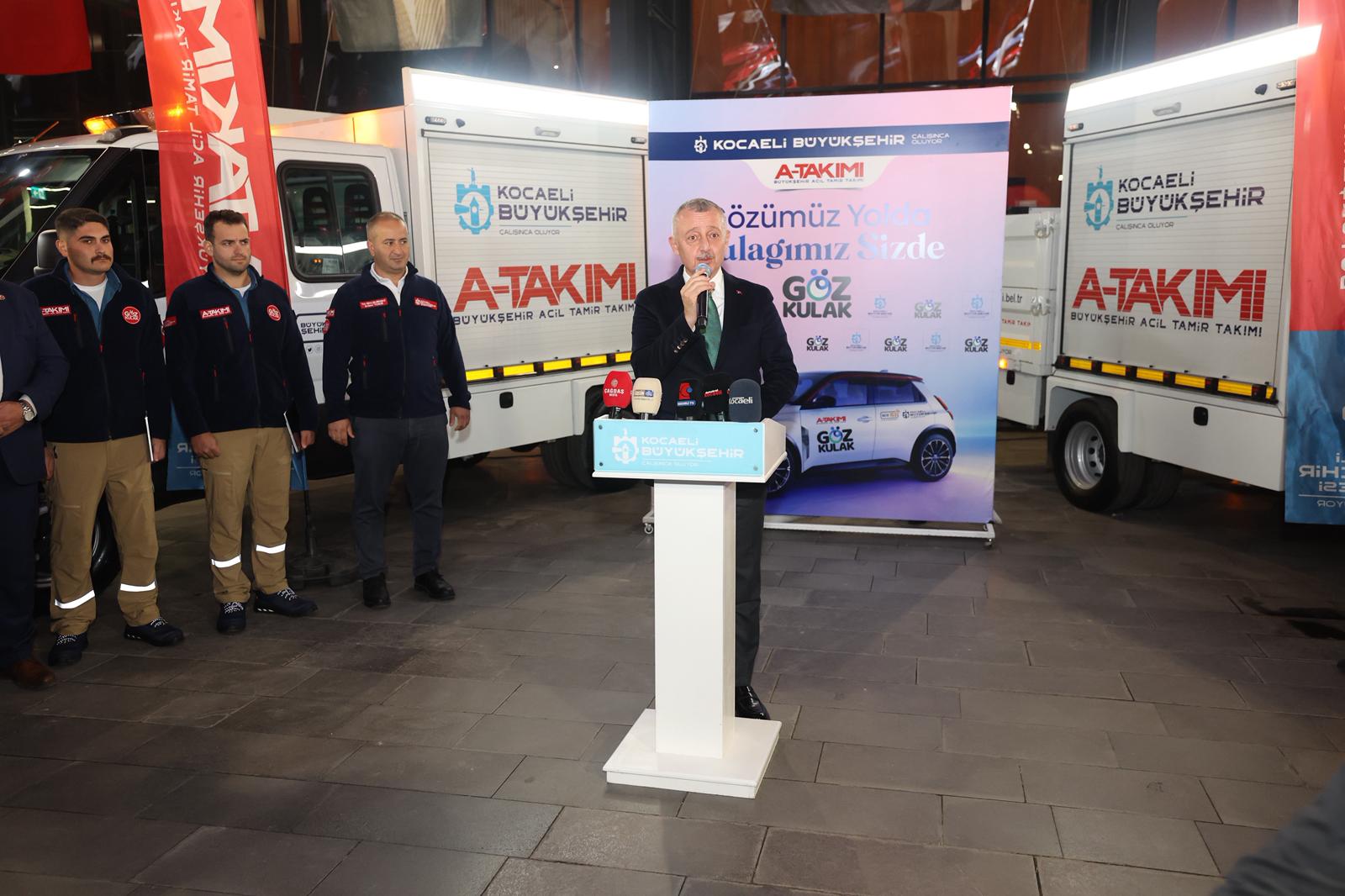Lansmanda konuşan Kocaeli Büyükşehir Belediye Başkanı Tahir Büyükakın, “A Takımı” olarak yola çıkan ekibin tamamen sahaya inmiş durumda olduğunu belirtti. Göz Kulak Ekibi hakkında bilgi veren Başkan Büyükakın, "Bugün itibarıyla araç sayımız 288’e, personel sayımız ise 512’ye ulaştı. Zaman zaman artan ihtiyaçlar doğrultusunda 239 ilave araç ve iş makinemiz de hizmet veriyor. Ayrıca 43 yeni aracın alım süreci devam ediyor. Şu anda sahada görev yapan 10 adet acil tamir ve bakım aracımız bulunuyor; bu araçlar, ihtiyaç duyulan noktalara gidip gerekli işlemleri hızla tamamlıyor.