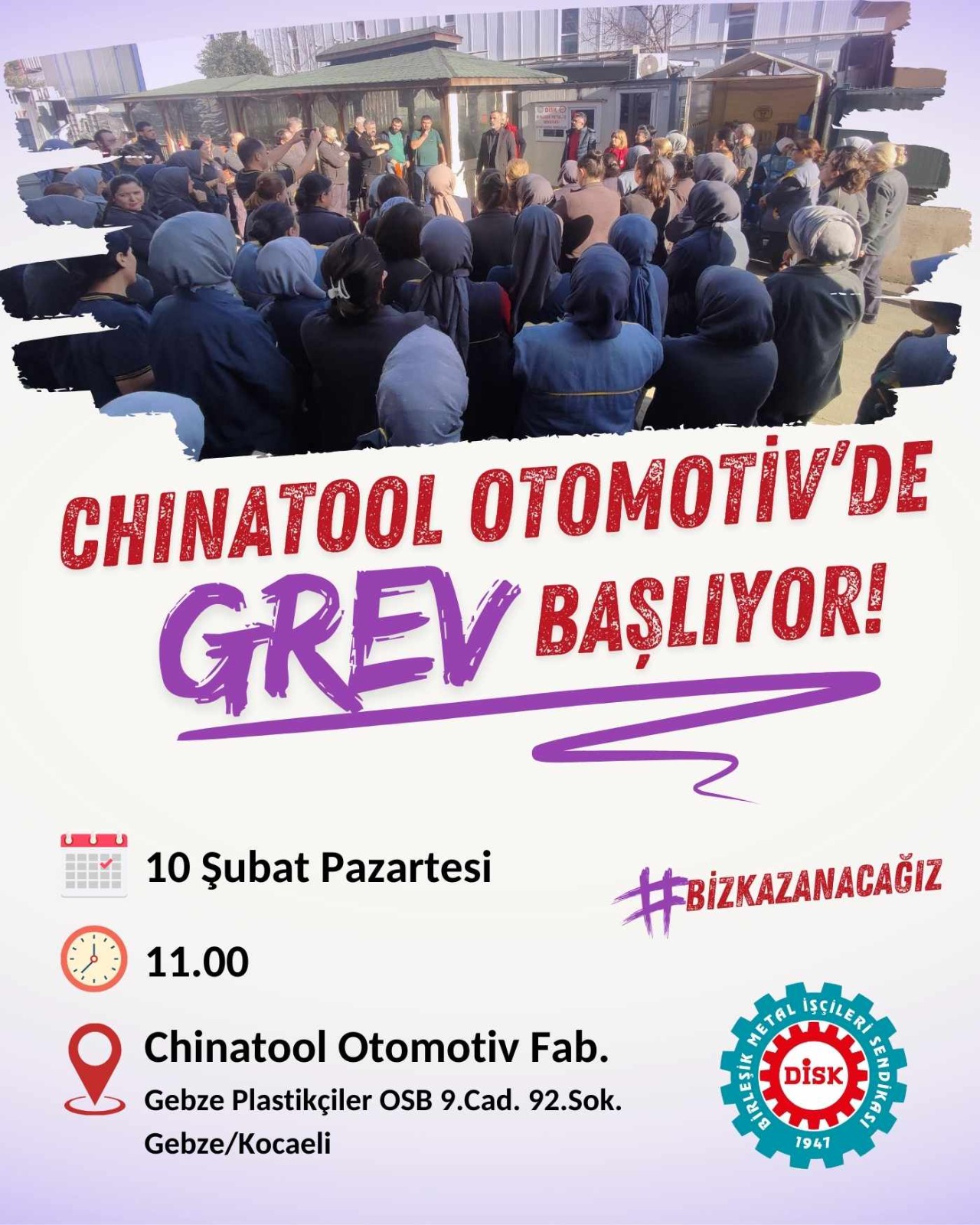 Chinatool Otomotiv'de 130'u kadın toplam 183 üyemizle birlikte pazartesi günü saat 11.00'de fabrikanın önünde yapacağımız basın açıklamasının ardından grev pankartımızı asacağız. Tüm sınıf kardeşlerimizi, sendikaları, emek dostlarını ve kadınları, kadın örgütlerini grevimizle dayanışmaya davet ediyoruz."