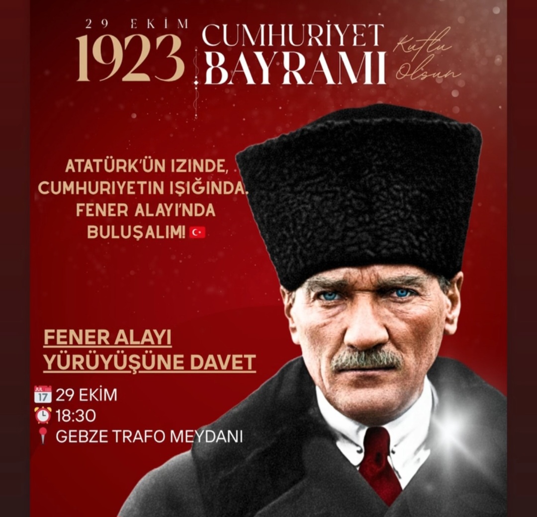 Cumhuriyet Halk Partisi (CHP) Gebze İlçe Başkanlığı, 29 Ekim Cumhuriyet Bayramı coşkusunu Gebzelilerle birlikte kutlamak için özel bir etkinlik düzenliyor. Ulu Önder Gazi Mustafa Kemal Atatürk'ün izinde, Cumhuriyetin aydınlığında bir araya gelme çağrısı yapılan etkinlik, coşkulu bir Fener Alayı yürüyüşü şeklinde gerçekleşecek.