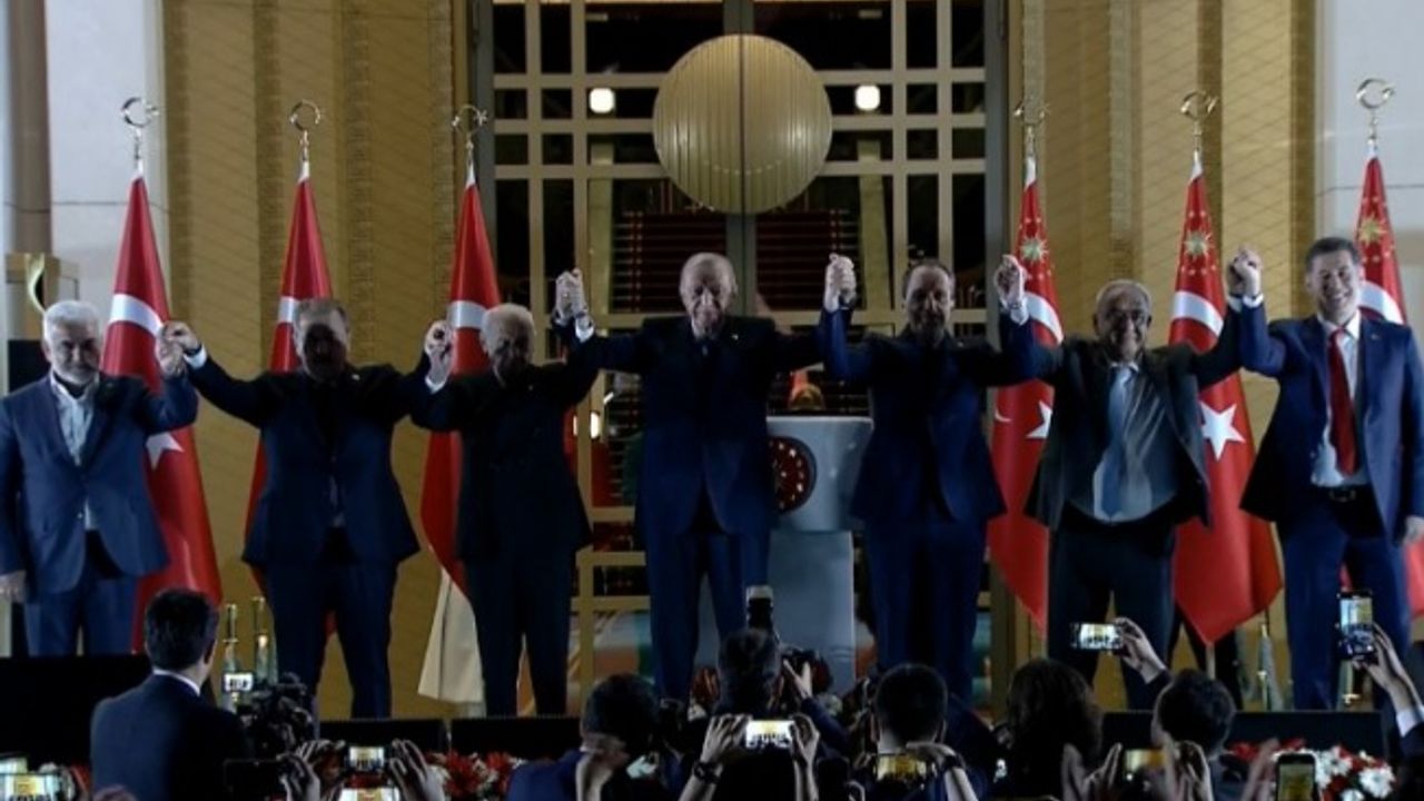 Cumhurbaşkanı Erdoğan'ın konuşmasının sonunda Cumhur İttifakı'nı oluşturan partilerin liderleri "Beraber yürüdük biz bu yollarda" şarkısı eşliğinde kürsüye takdim edildi. Cumhurbaşkanı Erdoğan, liderlerle birlikte el ele tutuşarak, Beştepe'deki vatandaşları selamladılar.
