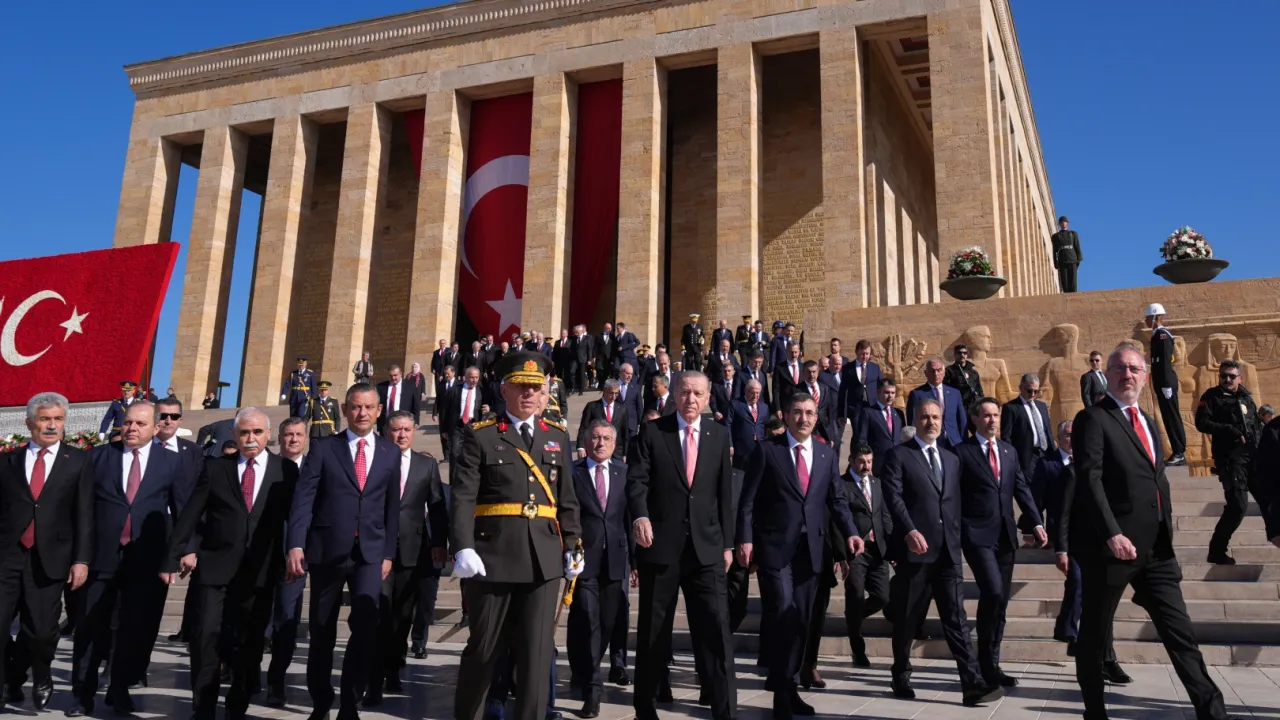 Cumhurbaşkanı Recep Tayyip Erdoğan başkanlığındaki devlet erkanı, 29 Ekim Cumhuriyet Bayramı ve Cumhuriyet'in ilanının 101'inci yıl dönümü dolayısıyla Anıtkabir'i ziyaret etti.ANKARA (İGFA) - Cumhuriyet'in ilanının 101'inci yıl dönümü kutlamaları kapsamında ilk tören, Anıtkabir'de düzenlendi. Tören, devlet erkanının Aslanlı Yol'da yürüyüşüyle başladı. Cumhurbaşkanı Erdoğan'ın başkanlığındaki Aslanlı Yol'daki kortejde, Türkiye Büyük Millet Meclisi Başkanı Numan Kurtulmuş, Cumhurbaşkanı Yardımcısı Cevdet Yılmaz, CHP Genel Başkanı Özgür Özel, MHP Genel Başkanı Devlet Bahçeli, İYİ Parti Genel Başkanı Müsavat Dervişoğlu, Cumhurbaşkanlığı Kabinesi üyeleri, yüksek yargı organlarının başkanları, Genelkurmay Başkanı Orgeneral Metin Gürak, kuvvet komutanları, siyasi partilerin temsilcileri ve diğer devlet erkanı yer aldı.