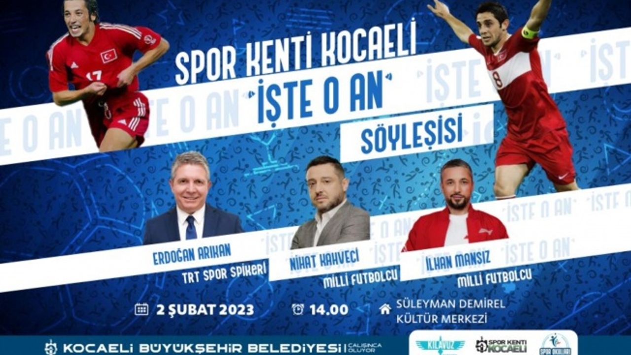 Kocaeli’nin spor kenti olması için yatırımlarına aralıksız olarak devam eden Büyükşehir, bir yandan da Kocaelili sporseverleri yıldız isimlerle bir araya getiriyor. 2 Şubat Perşembe günü SDKM’de saat 14.00’te başlayacak ‘‘İşte O An’’ söyleyişinde Türk futbolunun milli yıldızları Nihat Kahveci ve İlhan Mansız, tanınmış spor spikeri Erdoğan Arıkan’ın moderatörlüğünde yaşadıkları ‘’o anları’’ anlatacak.