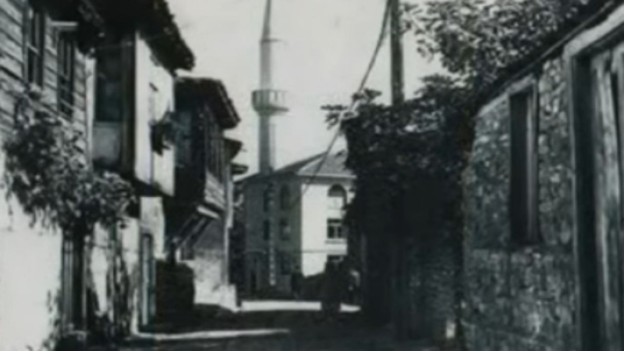 Tarihi Çarşı Hamamından aşağıya doğru inen sokaktan çekilen fotoğrafta Karabakkal Cami görülüyor. Sokağın her iki yanında bugün olmayan eski bahçeli binalar var.