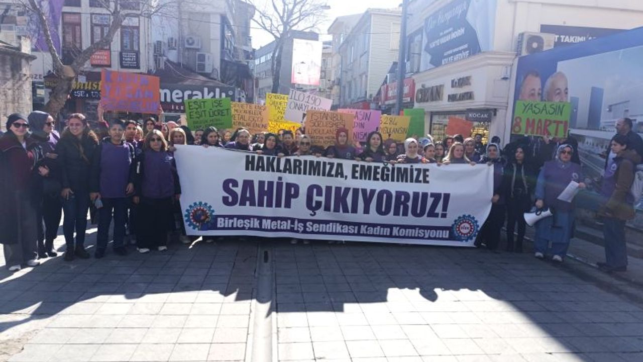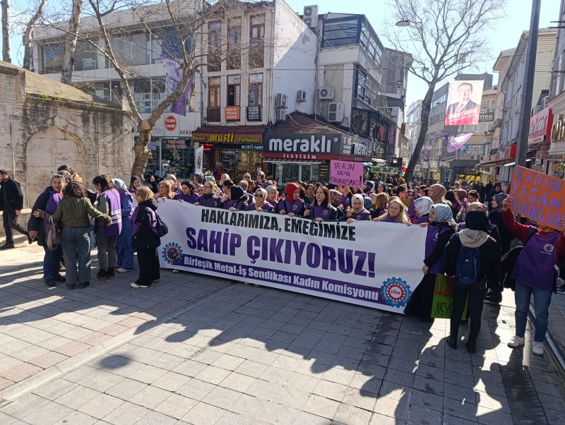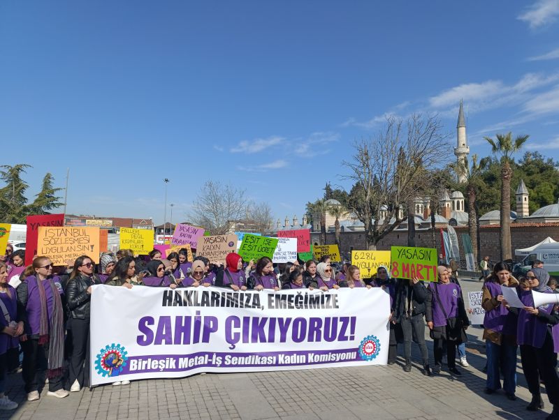 Gebze 1, Gebze 2 ve Bursa şubelerine bağlı fabrikalardan gelen kadın işçiler, "Yaşasın 8 Mart, yaşasın kadın dayanışması!", "ILO 190 onaylansın, 6284 uygulansın!", "İstanbul Sözleşmesi'nden vazgeçmiyoruz!", "Kadın yaşam özgürlük!", "Yaşasın örgütlü mücadelemiz!", "Her kadına sendikalı, güvenceli iş, her işyerine kreş" gibi sloganlarla Kent Meydanı'na yürüdü.
