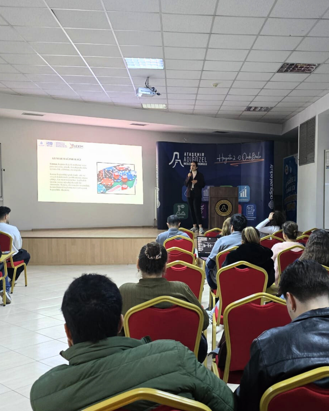 Toplum sağlığını tehdit eden bağımlılık türleriyle mücadele kapsamında Ataşehir Adıgüzel Meslek Yüksekokulu’nda, sanal kumar ve bahis bağımlılığına karşı toplumsal farkındalık oluşturmak amacıyla bir seminer düzenlendi. İBB Sağlık Bağımlılıkla Mücadele Şube Müdürlüğü’nde görev yapan uzman Klinik Psikolog Beril Gülsüm Cılasın tarafından gerçekleştirilen seminerde, dijitalleşmeyle birlikte ortaya çıkan yeni bağımlılık türlerinin özellikle gençler üzerindeki bireysel ve toplumsal etkileri ele alındı.
