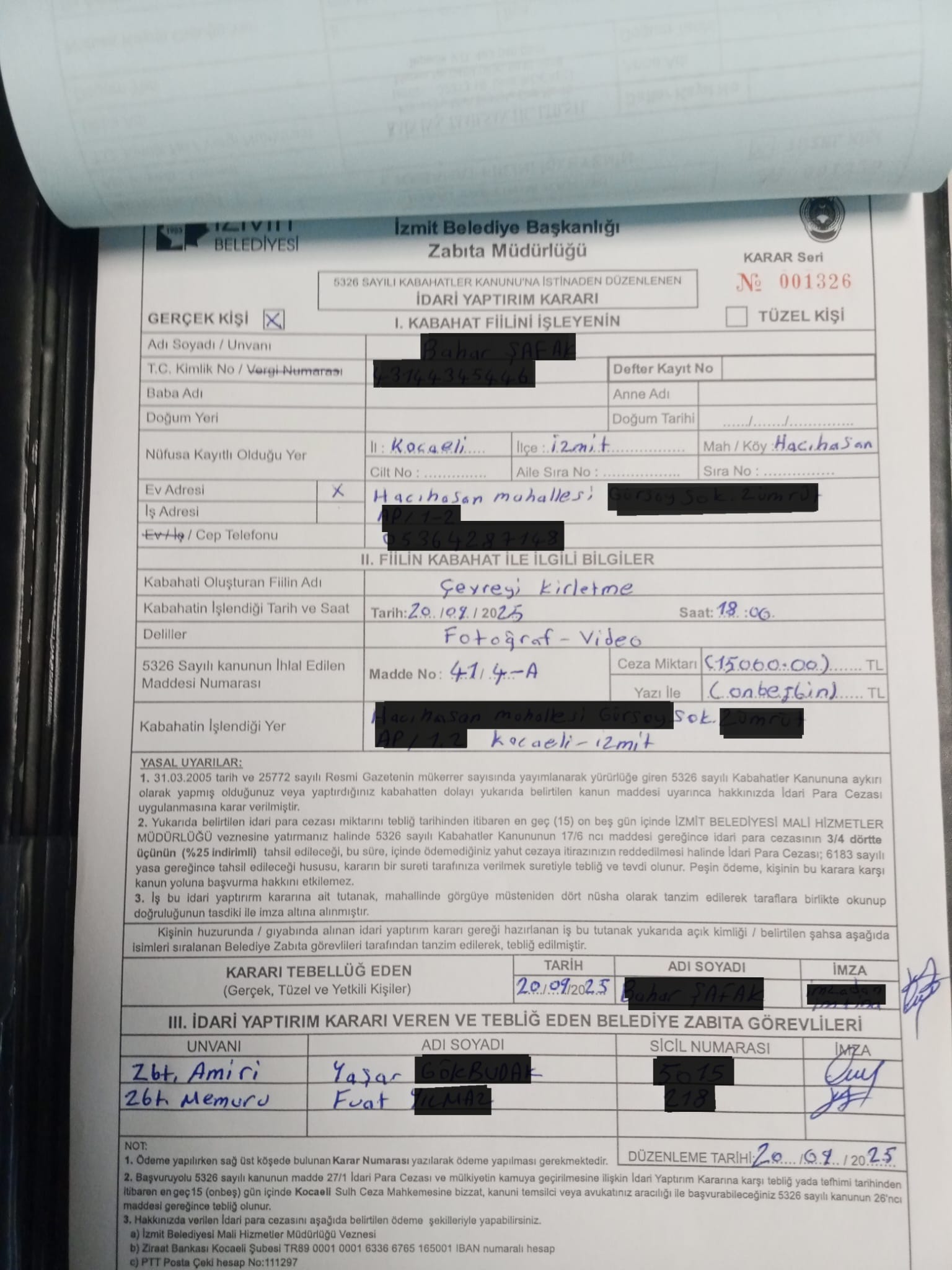 Zabıta Müdürlüğü ekipleri tarafından adresi belirlenen kişiye, 5326 Sayılı Kabahatler Kanunu kapsamında 15 bin TL idari para cezası uygulandı.