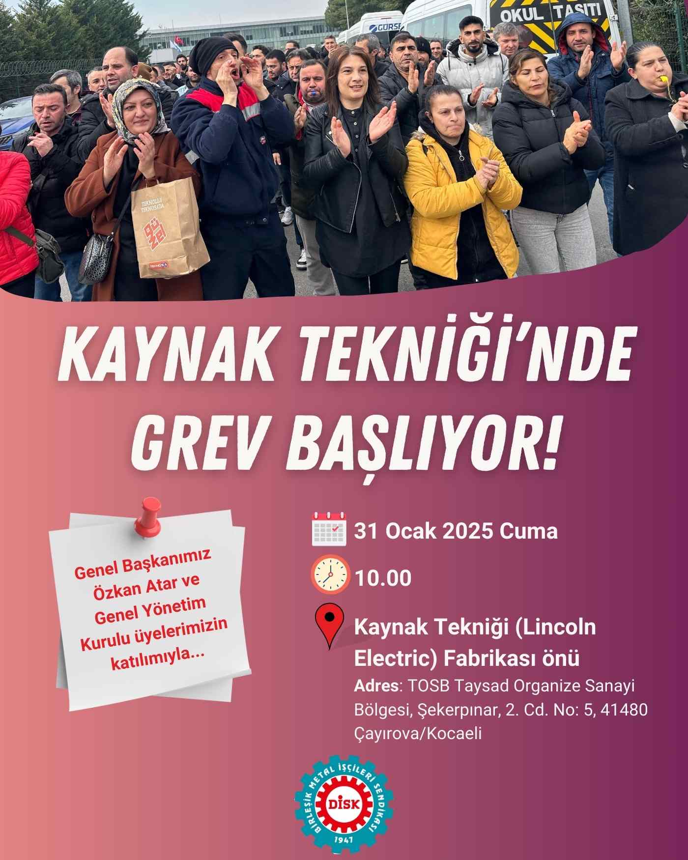 Birleşik Metal-İş Sendikası, Çayırova’da kurulu Kaynak Tekniği Sanayi ve Ticaret Anonim Şirketi (Lincoln Electric) işyerinde 31 Ocak 2025 Cuma günü saat 10.00'da greve başlayacağını duyurdu.