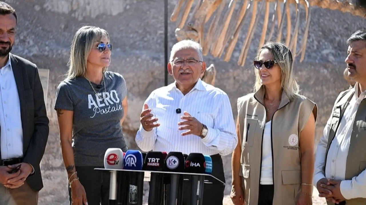 Bu kapsamda Büyükşehir Belediye Başkanı Dr. Memduh Büyükkılıç, kazı alanında gün yüzüne çıkarılan zürafagillerden bir fosilin de replikasının sergilendiği bölgede incelemelerde bulundu.