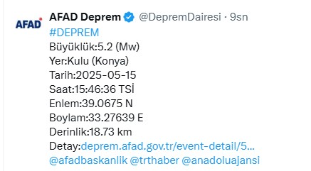 Konya'nın Kulu ilçesinde bugün saat 15:46:36 TSİ'de 5.2 büyüklüğünde bir deprem meydana geldi. AFAD verilerine göre, depremin merkez üssü Kulu olarak belirlendi.