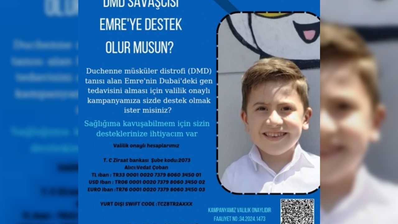 Duchenne Musküler Distrofi (DMD) kas hastalığı ile mücadele eden küçük Emre Çoban'ın Duabi'de gen tedavisi olabilmesi için gerekli olan paranın toplanması amacıyla valilik onaylı yardım kampanyası başlatıldı.