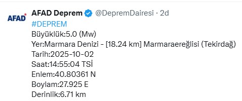 Afet ve Acil Durum Yönetimi Başkanlığı (AFAD), Marmara Denizi'nde Tekirdağ'ın Marmaraereğlisi ilçesi açıklarında orta şiddette bir deprem meydana geldiğini duyurdu.