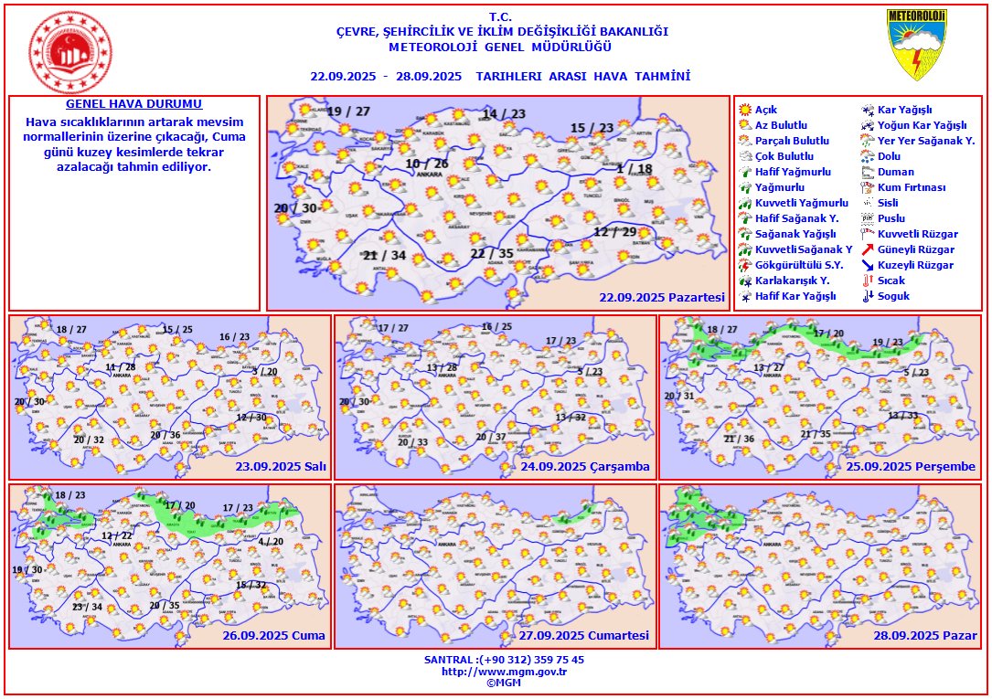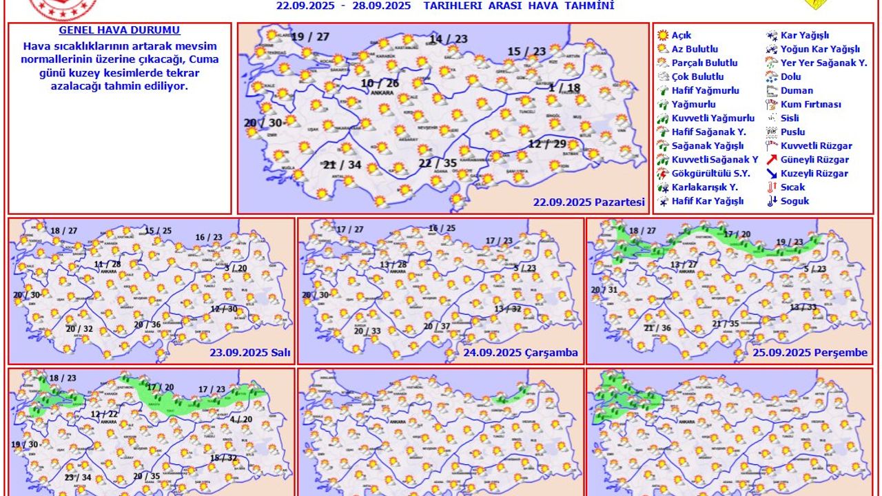 Meteoroloji Genel Müdürlüğü'nün 22-28 Eylül 2025 tarihlerini kapsayan hava tahmin raporuna göre, Türkiye genelinde hava sıcaklıkları mevsim normallerinin üzerinde seyretmeye devam ediyor. Ancak hafta sonuna doğru hava koşullarında belirgin bir değişiklik bekleniyor.