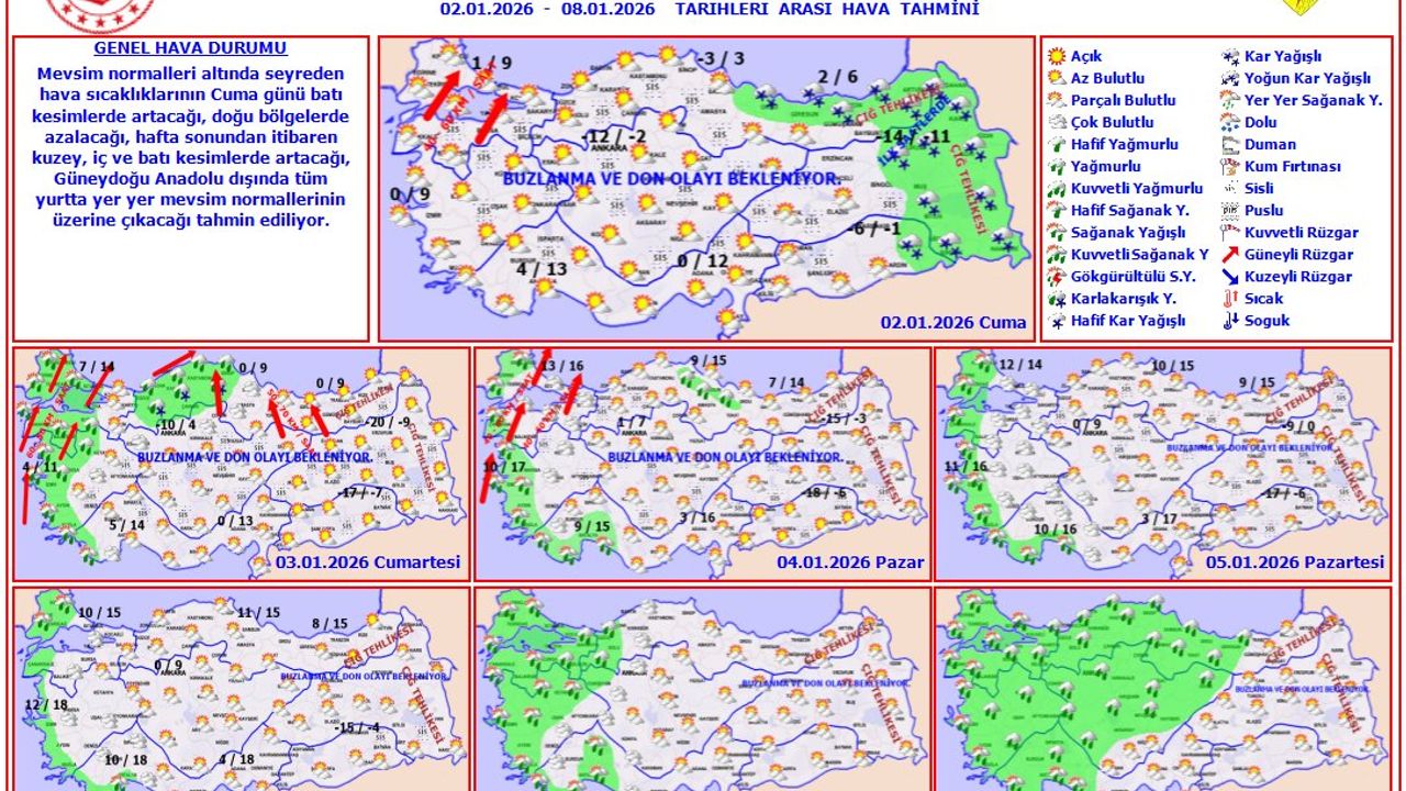 2 Ocak – 8 Ocak 2026 tarihleri arasını kapsayan yeni hava tahmin raporu yayımlandı. Meteoroloji Genel Müdürlüğü’nün verilerine göre, dondurucu soğukların ardından Türkiye genelinde hava sıcaklıklarında önemli değişiklikler bekleniyor.