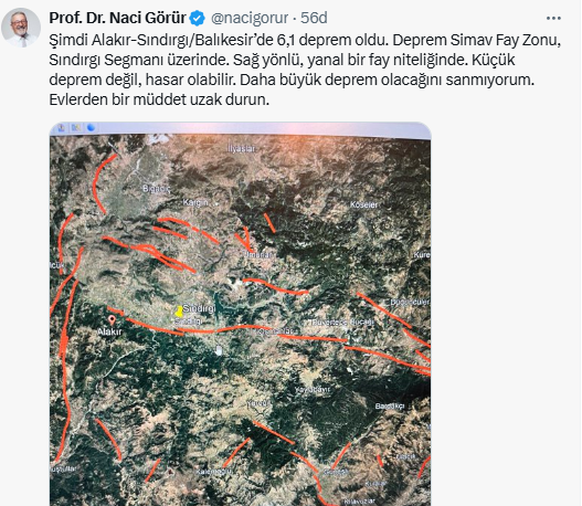 "Şimdi Alakır-Sındırgı/Balıkesir’de 6,1 deprem oldu. Deprem Simav Fay Zonu, Sındırgı Segmanı üzerinde. Sağ yönlü, yanal bir fay niteliğinde. Küçük deprem değil, hasar olabilir. Daha büyük deprem olacağını sanmıyorum. Evlerden bir müddet uzak durun."