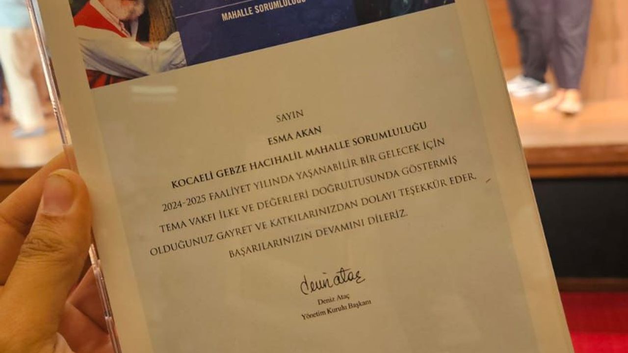 TEMA Vakfı Gebze Hacı Halil Mahalle Sorumlusu ve Hürriyetçi Eğitim Sen Gebze İlçe Sekreteri Esma Akan, 2024-2025 faaliyet yılı kapsamında verilen Hayrettin Karaca ve Ali Nihat Gökyiğit Eğitim Ödülü'nü ikinci kez almaya hak kazandı.